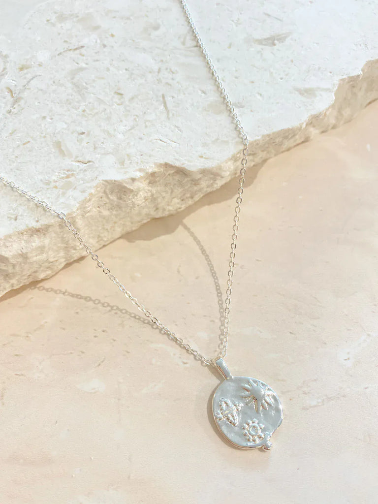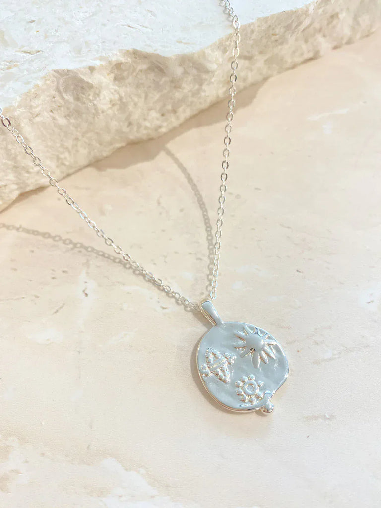 Thick silver plated round coin pendant on a refined 47cm chain.