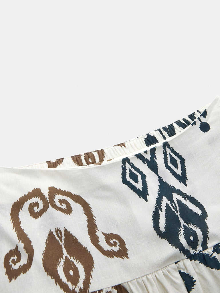 - Navy and tan print on an off white background