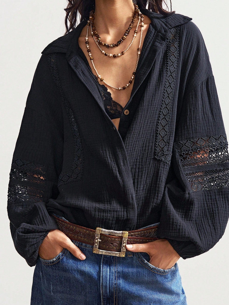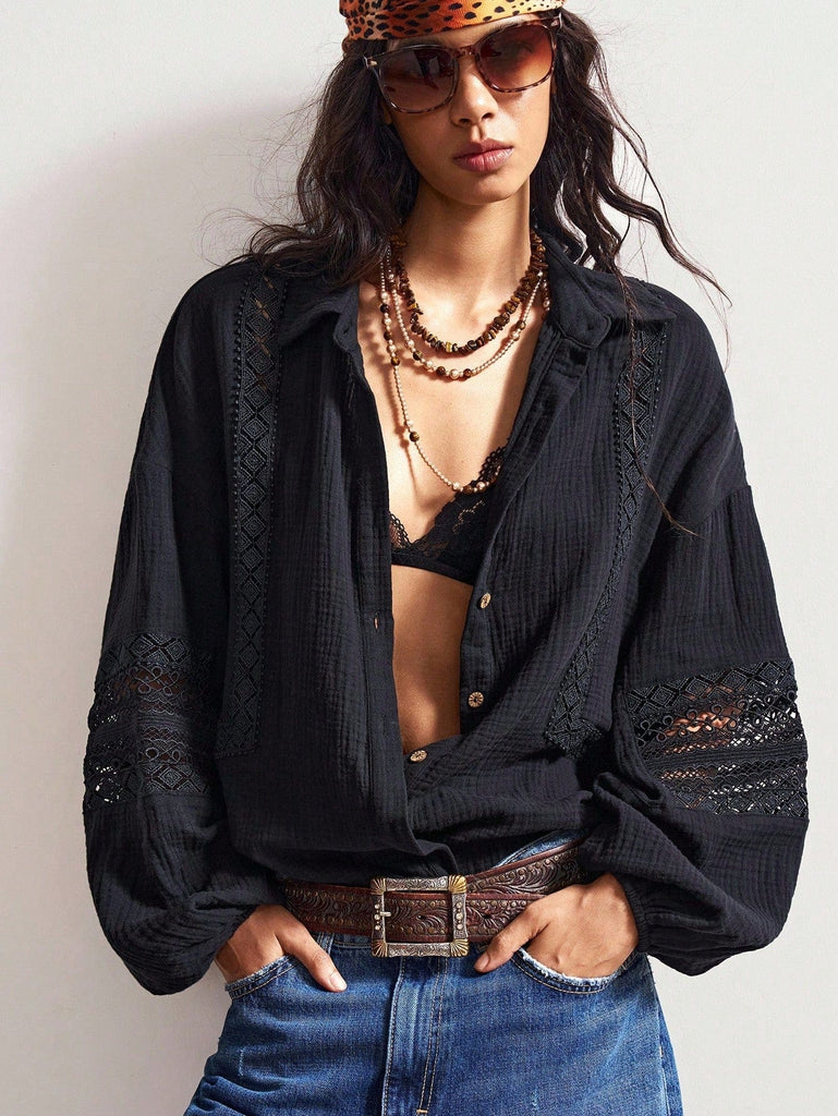 • Black cotton top with insert crochet detail to sleeves and front